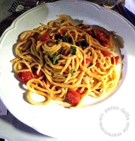 Abbiamo iniziato con un antipasto molto delicato, vellutata di pomodoro con crostini il tutto condito con olio extravergine bio della Sabina, mousse di baccalà; risotto alle zucchine, gnocchetti di “coda de soreca” all’amatriciana, una pasta fatta con acqua e farina, a me un ottimo piatto di queste stupende codice di sorcio, tradotto, al pomodoro e basilico, davvero molto buoni; involtini di vitellone, e trippa alla romana che io non ho mangiato; misticanza di stagione, e cicoria ripassata in padella; e ancora, ciambelline al vino le tipiche ciambelline dei castelli romani e un semifreddo al melone. Ottimo il liquore al finocchietto.