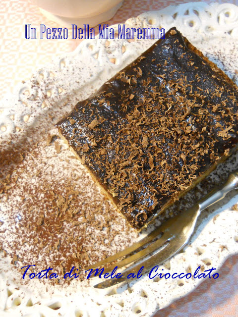 Nel frattempo mettete a sciogliere il cioccolato insieme al burro e ai cucchiai di latte, una volta pronto versatelo sulla torta e ricopritela tutta, fatela freddare e poi spolverizzatela con del cacao e prima di servirla grattateci del cioccolato fondente, è una torta molto buona, un sapore diverso dalle solite torte con le mele.