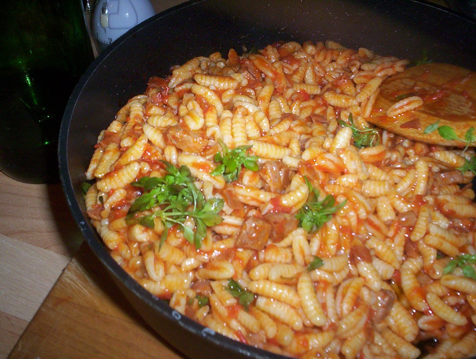 Ogni tanto si puà cucinare anche un piatto semplice come questi malloreddus alla Campidanese. Sono buoni, richiedono poco impegno, e in queste giornate afose meglio non stancarsi troppo. È uno dei piatti più famosi della Sardegna, conosciuto anche fuori dell’Italia e anche chi non ha voglia di farli a mano i malloreddus ormai si trovano in tutti i negozi e supermercati. Ricordo che circa 40 anni fa, mio padre, di ritorno da un lungo soggiorno per lavoro in Sardegna, siccome era in macchina, la riempi letteralmente di pacchi di malloreddus, perché all’epoca non si trovavano neppure a Roma e anche qualche confezione di bottarga (di quella un po’ meno visti anche a quei tempi i costi molto alti).