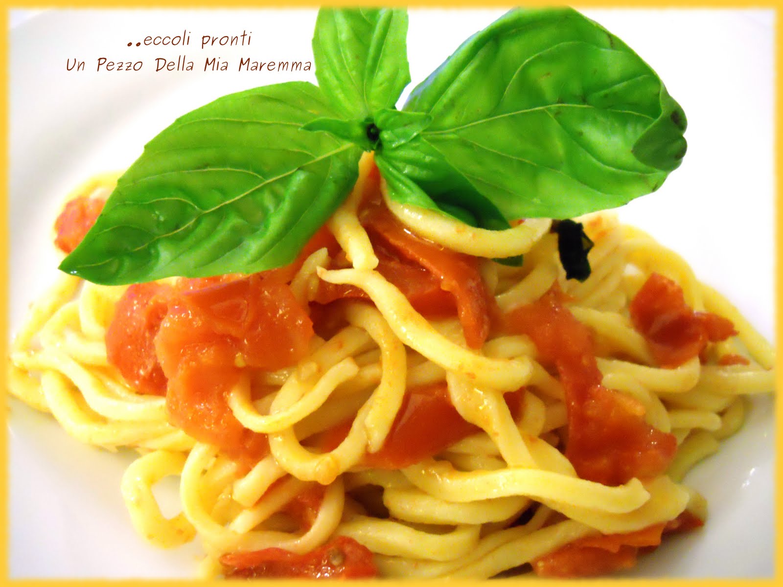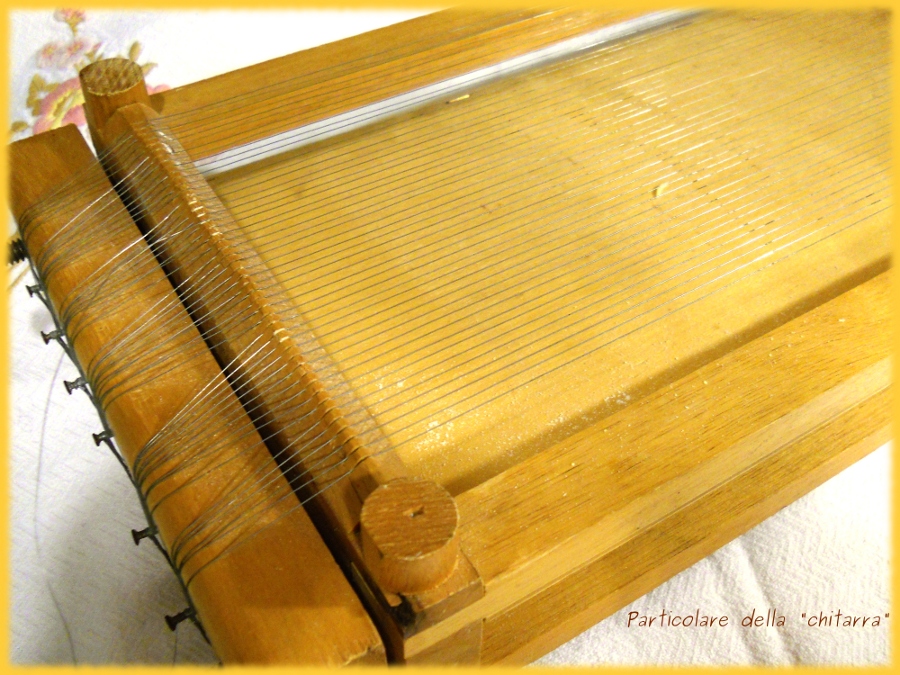 Gli spaghetti alla chitarra appartengono alla tradizione abruzzese e vengono fatti a mano, ancora oggi, con un manufatto che sembra una chitarra perché ha le corde e da quelle corde passa la pasta che viene tagliata e diventa spaghetti. La chitarra la comperò mia madre tanti anni fa, all’incirca 40 durante uno dei suoi spostamenti per l’Italia al seguito di babbo, ed è stata usata spesso, poi qualche mese fa durante una mia incursione a Grosseto me la sono portata via. Mi piace molto usarla, è facile veloce e la pasta viene benissimo.