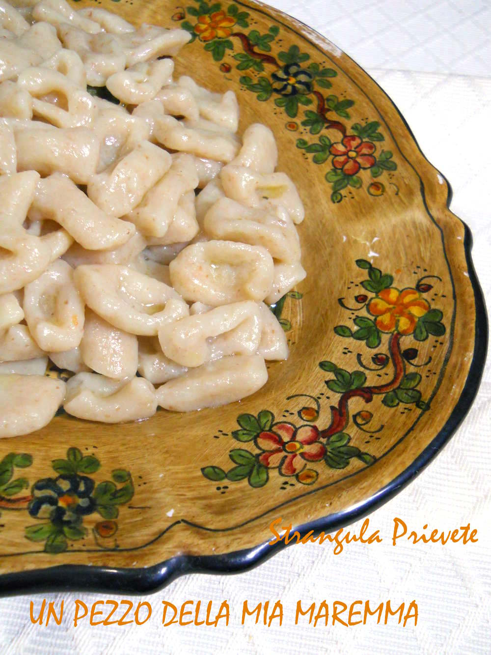 Noi, che ci occupiamo di cibo, cerchiamo di fare il nostro meglio scegliendo alimenti sani, ingredienti di stagione, non vogliamo mangiare i peperoni a gennaio e le fragole a dicembre, abbiamo la pazienza di aspettare, adesso ci godiamo le verdure invernali, quelle belle foglie verdi dei cavoli, i bianchi dei cavolfiori, il rosso dei radicchi trevisani e gli agrumi che tanto ci aiutano ad incamerare vitamina C, soffro quando vedo torte piene di fragole, ognuno è libero di mangiare le fragole a dicembre, ma qualche perplessità ce l’ho…intanto godiamoci questi deliziosi “strangola preti,” o “strangulaprievet”, andiamo subito nella cucina di Spery e vediamo come ha preparato queste delizie, che io, non mangiando più carne, ho condito con burro e salvia, tanta salvia e parmigiano. Vi dico anche che questo è lo stesso impasto con cui si fanno i Pici toscani, anche se adesso ci usa mettere un po’ di semola rimacinata e anche un uovo, però mia nonna li faceva così, con sola farina e acqua ed erano molto buoni.