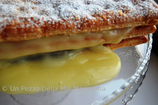 Non è un millefoglie proprio benissimo, nella foto non si vede, ma ho rotto tutta la parte di dietro tirandola fuori dal forno, si ra cotta di più su un lato, però le foto servono a mascherare i difetti, vero?